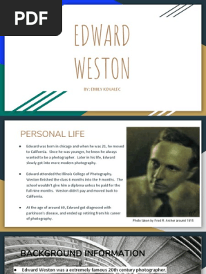 Edward senior remained chairman of the board of directors until his death in 1936. Edward weston was born in highland park illinois in 1886. The author spends a lot of time explaining just how different and unique photography is. A self taught photographer weston is best known for his still life photographs of peppers and shells his heroic portraits and abstract close ups of nudes rocks.